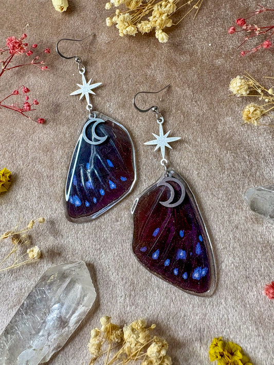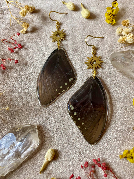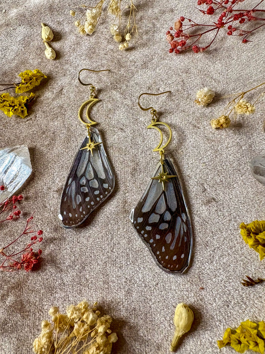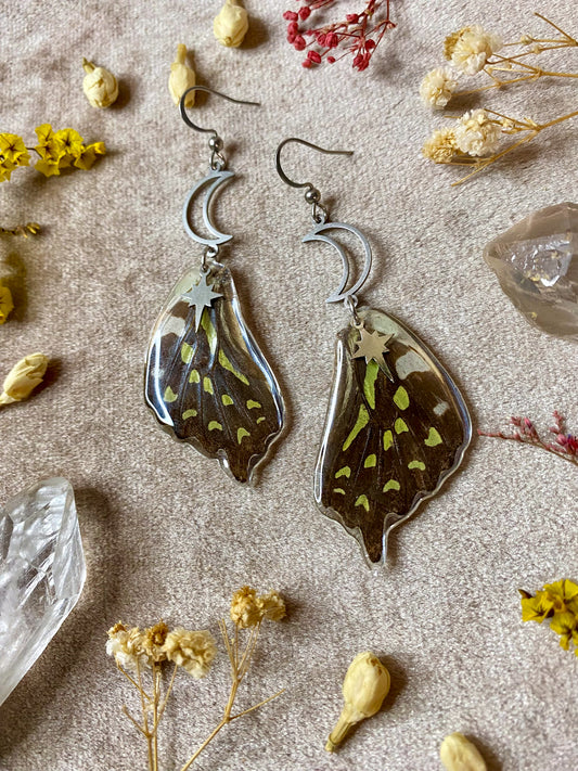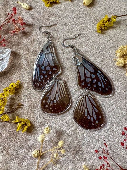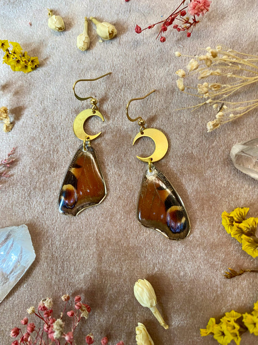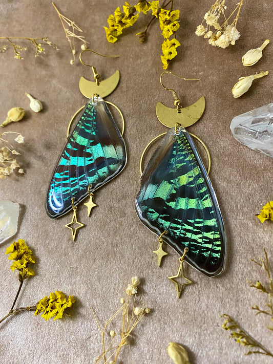 Earrings in this collection were created using real butterfly and moth wings. It is important to note that none of the butterflies and moths were killed. The wings were obtained from preservation farms after they passed naturally.