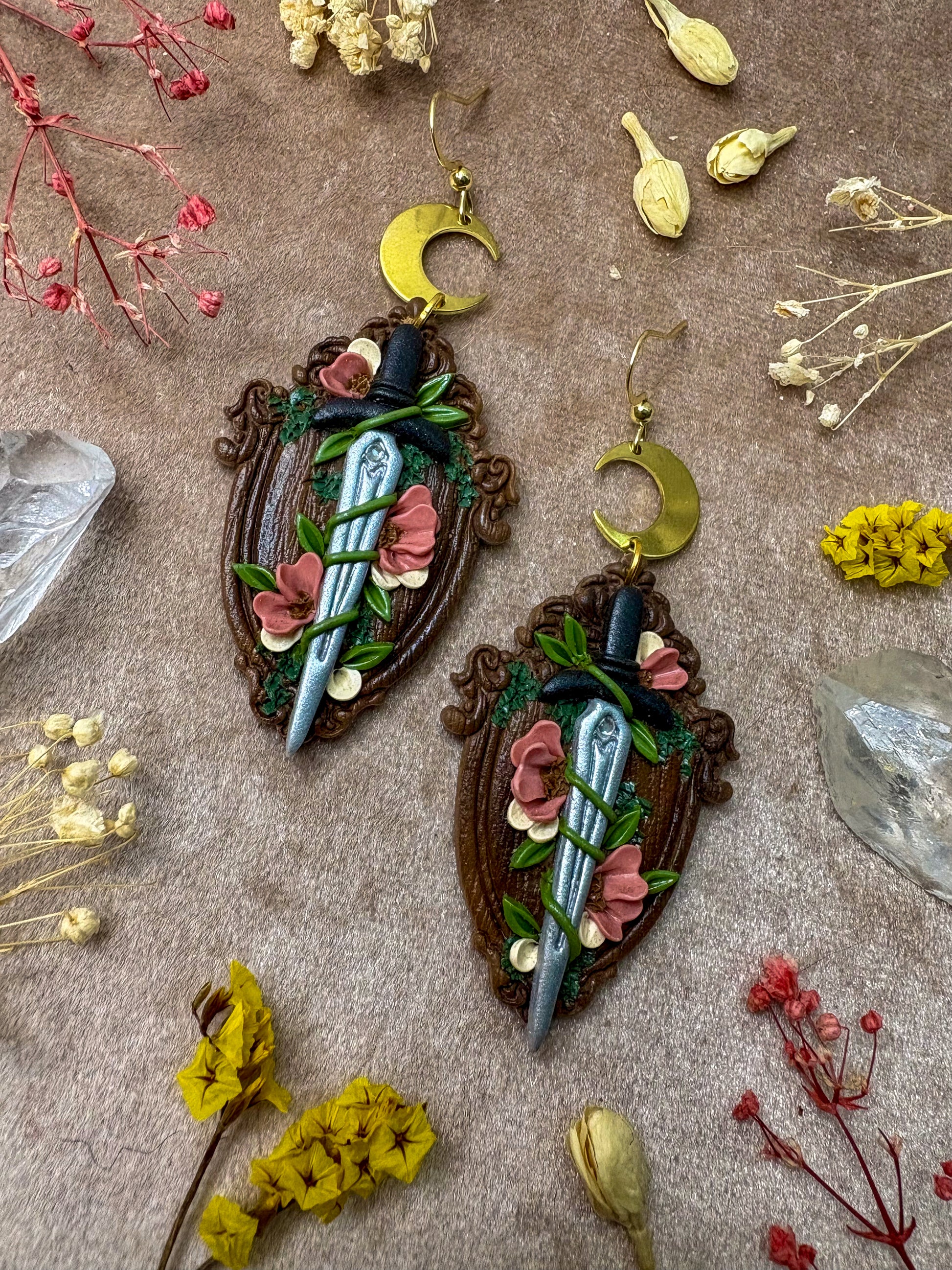 Wooden Floral Sword Frame Earrings