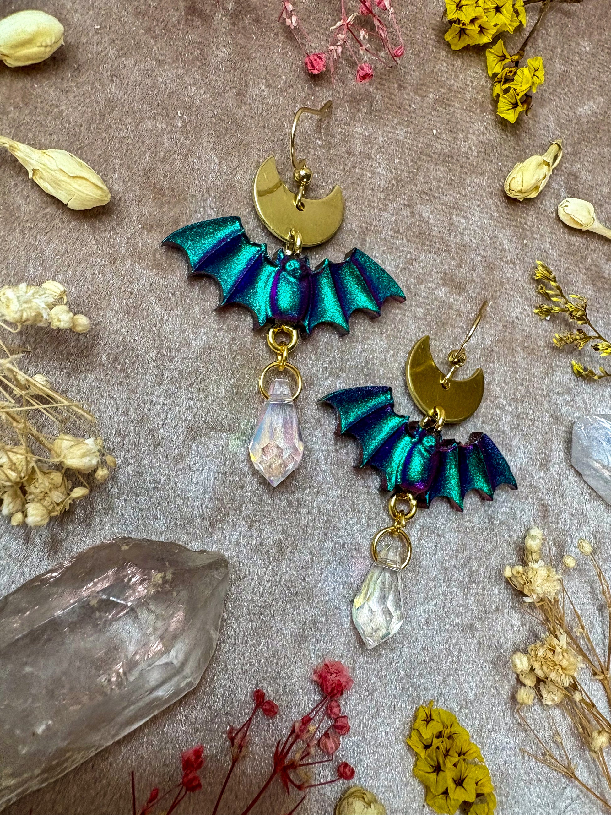 Bats may look a little scary at times, but they're just cute little things and can even be glamourous! These bats change from a vibrant teal to a violet purple color depending on the light - much like the stone that dangles beneath it!